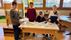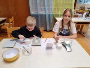 Im zweiten Teil des Projekts durften die Schülerinnen und Schüler im Rahmen eines Stationenbetriebs die Tätigkeiten einer Apothekerin / eines Apothekers näher kennnen lernen und selbst ausprobieren. So gab es die Möglichkeit Saccharose abzuwiegen, Flüssigkeiten in einem Messbecher abzumessen, Pflanzenteile zu erraten und eine Pflanzensammlung zu erkunden.