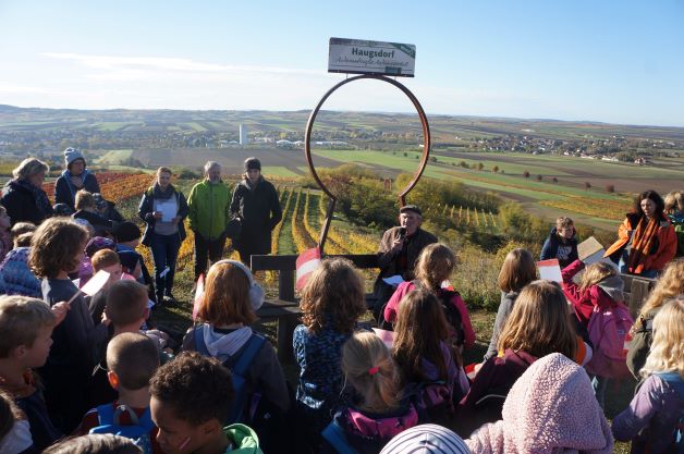 Heuer allerdings gestalteten wir unsere Feier ganz anders. Rund 130 Kinder marschierten mit ihren Lehrkräften am 25. Oktober bei strahlendem Sonnenschein – über dem Pulkautal lag noch der Dunst des nächtlichen Regens – hinauf zum Freiheitskreuz am Hutberg. Dort erzählte Johann Sailer über seine Kindheit in den Kriegsjahren und von der anschließenden Besatzungszeit. Beim Errichten des Freiheitskreuzes am 23. Oktober 1955 half Herr Sailer, seine große Gestalt ist auf der historischen Fotografie leicht zu erkennen, tatkräftig mit. Die Kinder hatten sich schon in den Tagen vorher Gedanken gemacht, was es bedeutet, in einem freien Österreich leben zu können und trugen diese vor. Josef Markl spielte für uns einen Zapfenstreich und begleitete uns beim Singen der Bundeshymne. Umgeben von einer prächtig gefärbten Herbstlandschaft, auch Schneeberg, Rax und Ötscher waren zu sehen, wurde dieser Tag ein tolles Gemeinschaftserlebnis für uns alle und es machte uns stolz, Österreichinnen und Österreicher zu sein.