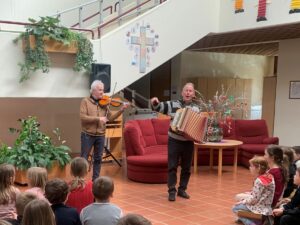 Norbert Hauer musizierte und tanzte zwei Tage lang mit allen Klassen und begeisterte die Schüler:innen mit